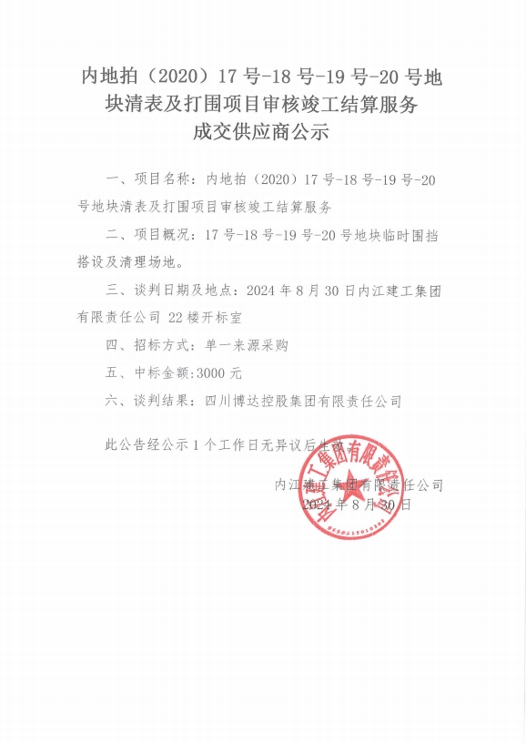 內(nèi)地拍(2020)17號-18號-19號-20號地塊清表及打圍項目審核竣工結(jié)算服務(wù) 成交供應(yīng)商公示
