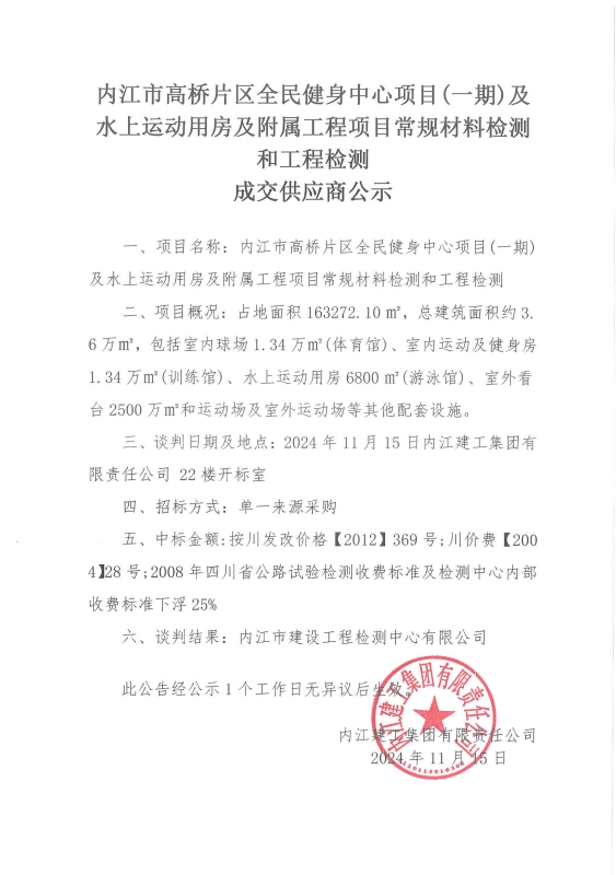 內(nèi)江市高橋片區(qū)全民健身中心項目(一期)及水上運動用房及附屬工程項目常規(guī)材料檢測和工程檢測 成交供應(yīng)商